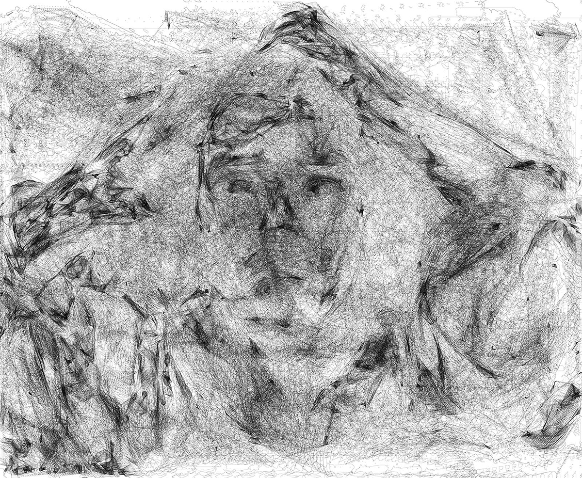 But feeding these shapes back into the Blend tool over and over has the opposite effect – as the density of shapes multiplies, the blending paths themselves begin building up new contours that give the portrait a sense of dimension again.