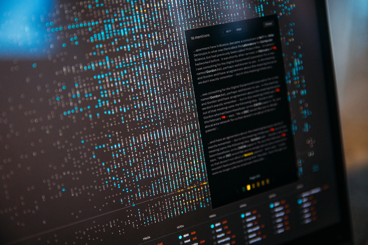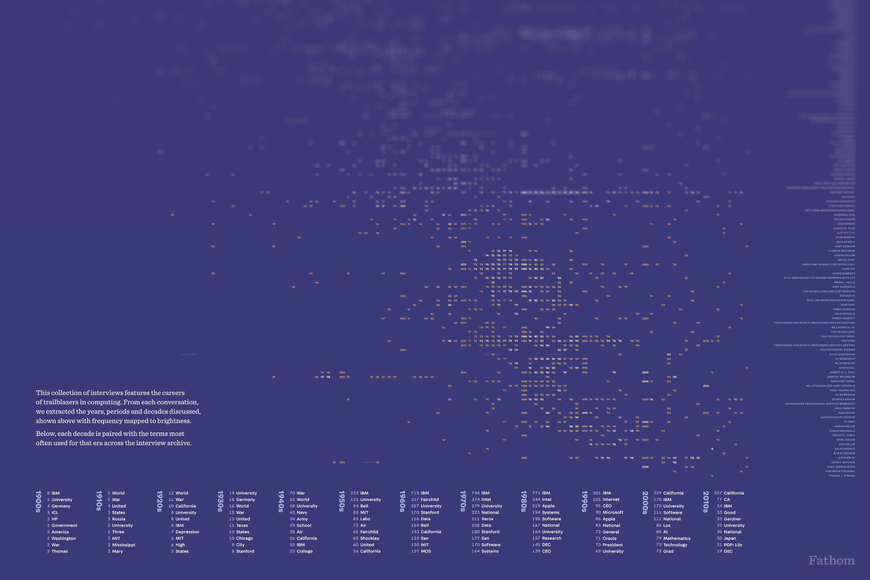 We developed an interactive installation to parse and explore the Computer History Museum’s archive of interviews with pioneers in computing. The collection spans 120 years of stories from over 800 individuals, from Jean Bartick, one of the first programmers of ENIAC, to Robert Metcalfe, the co-founder of Ethernet, to DEVO frontman and keyboardist Mark Mothersbaugh.