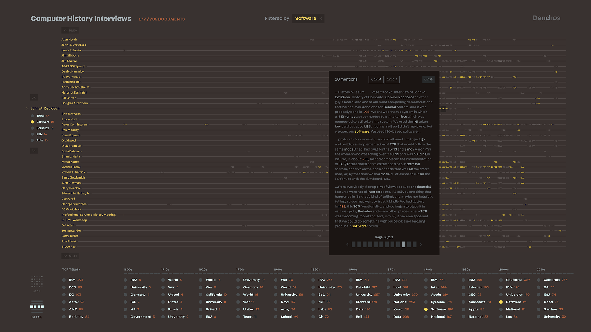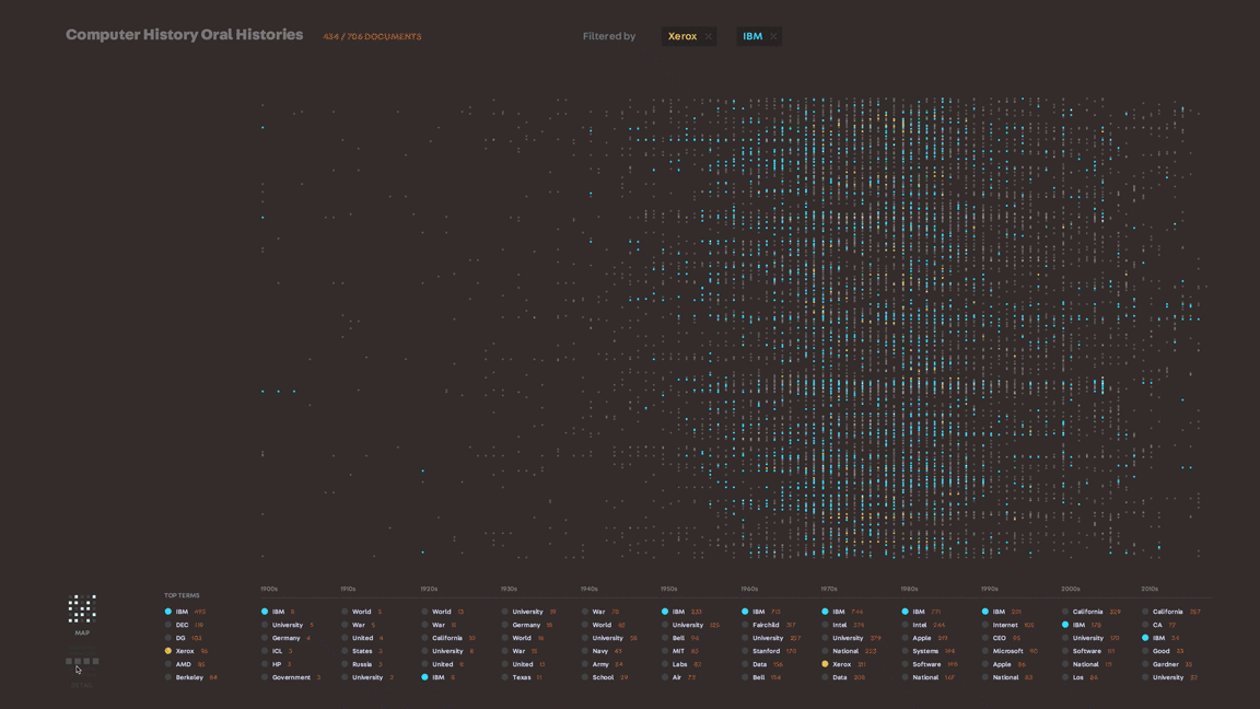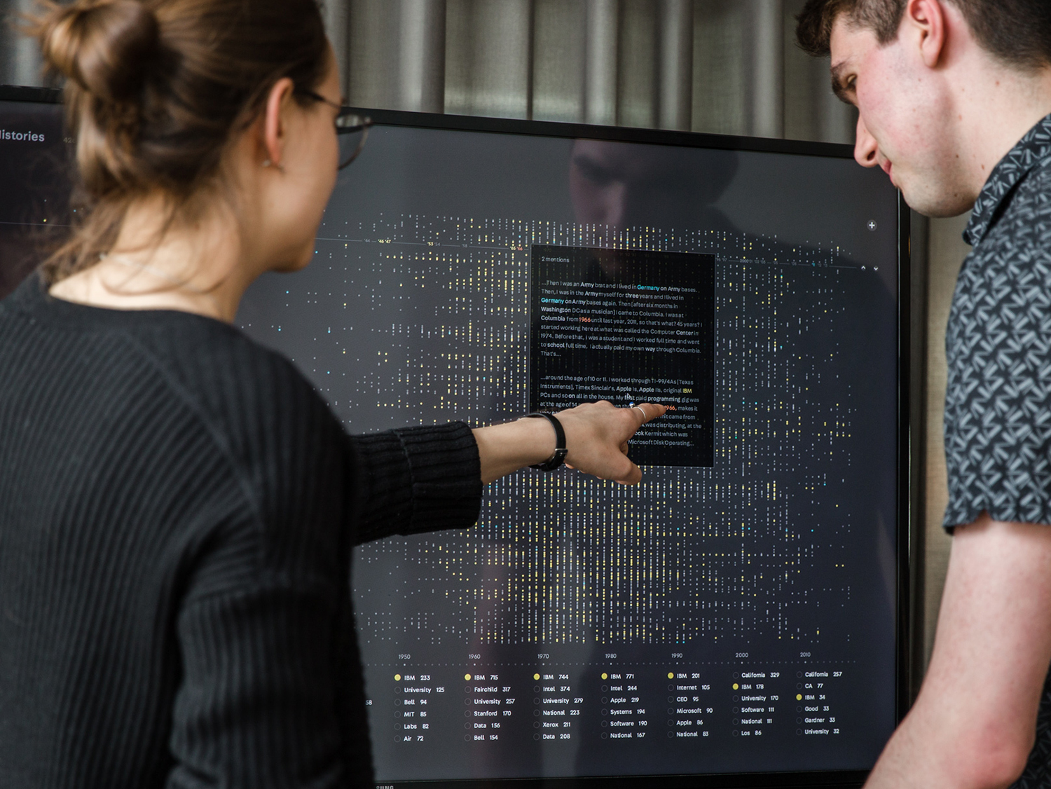 In the interactive installation, users can apply those terms to filter the timelines and delve into the interviews for the full context of how those ideas are mentioned in conversation.