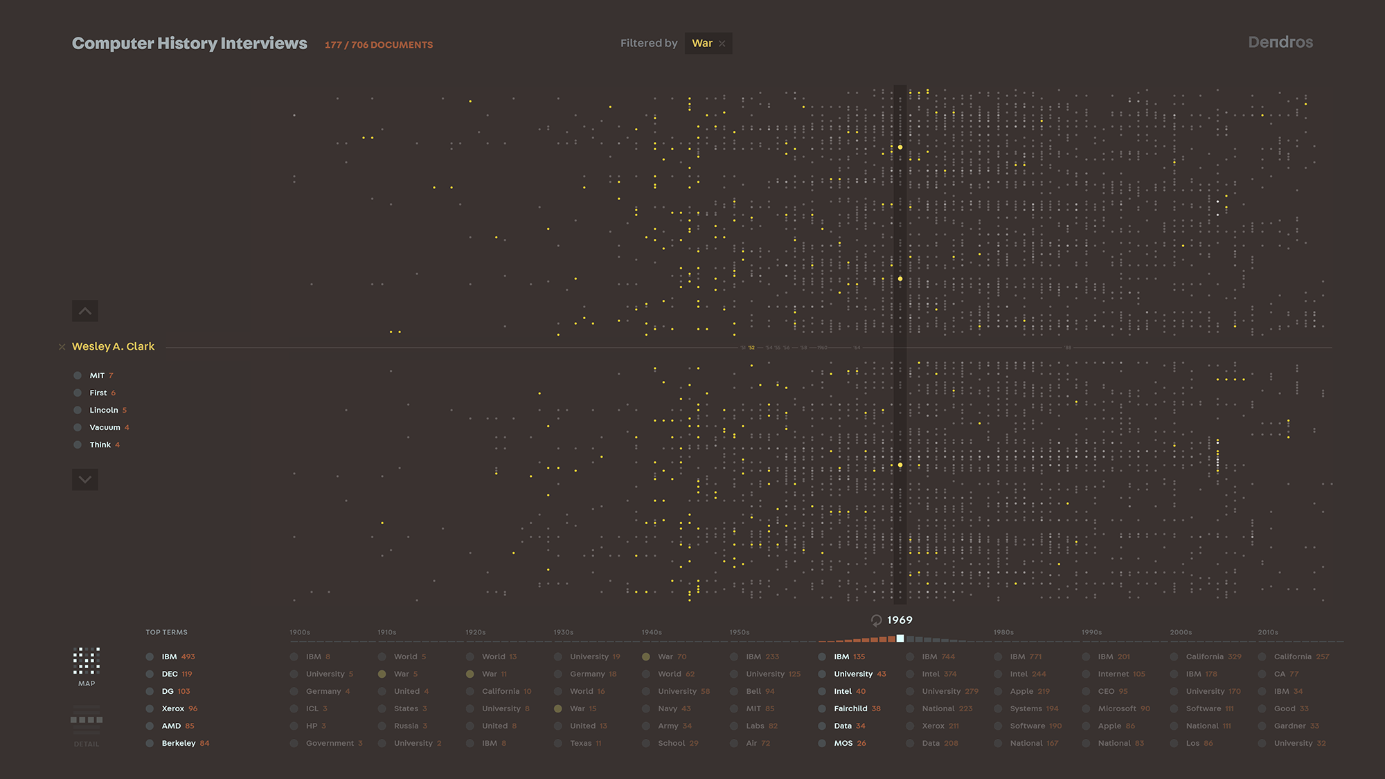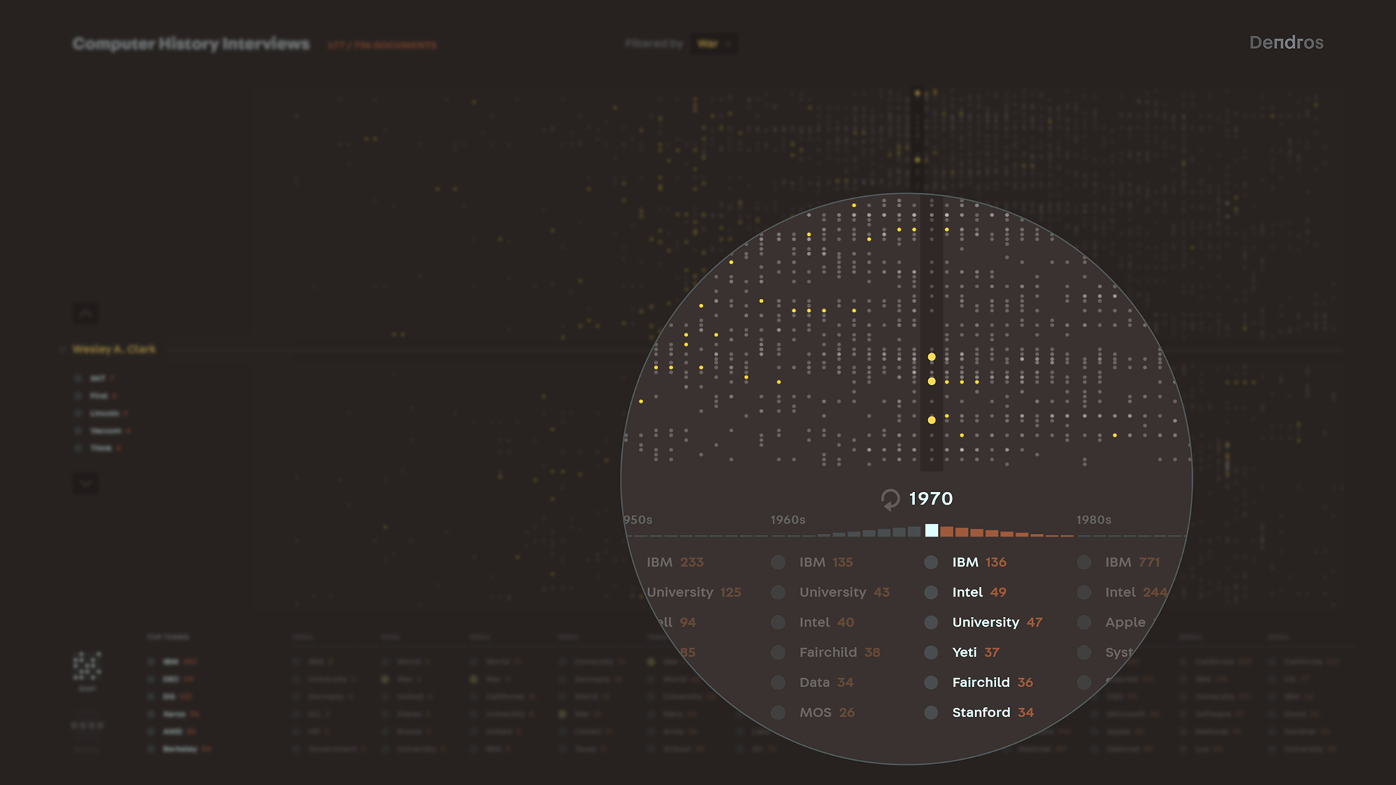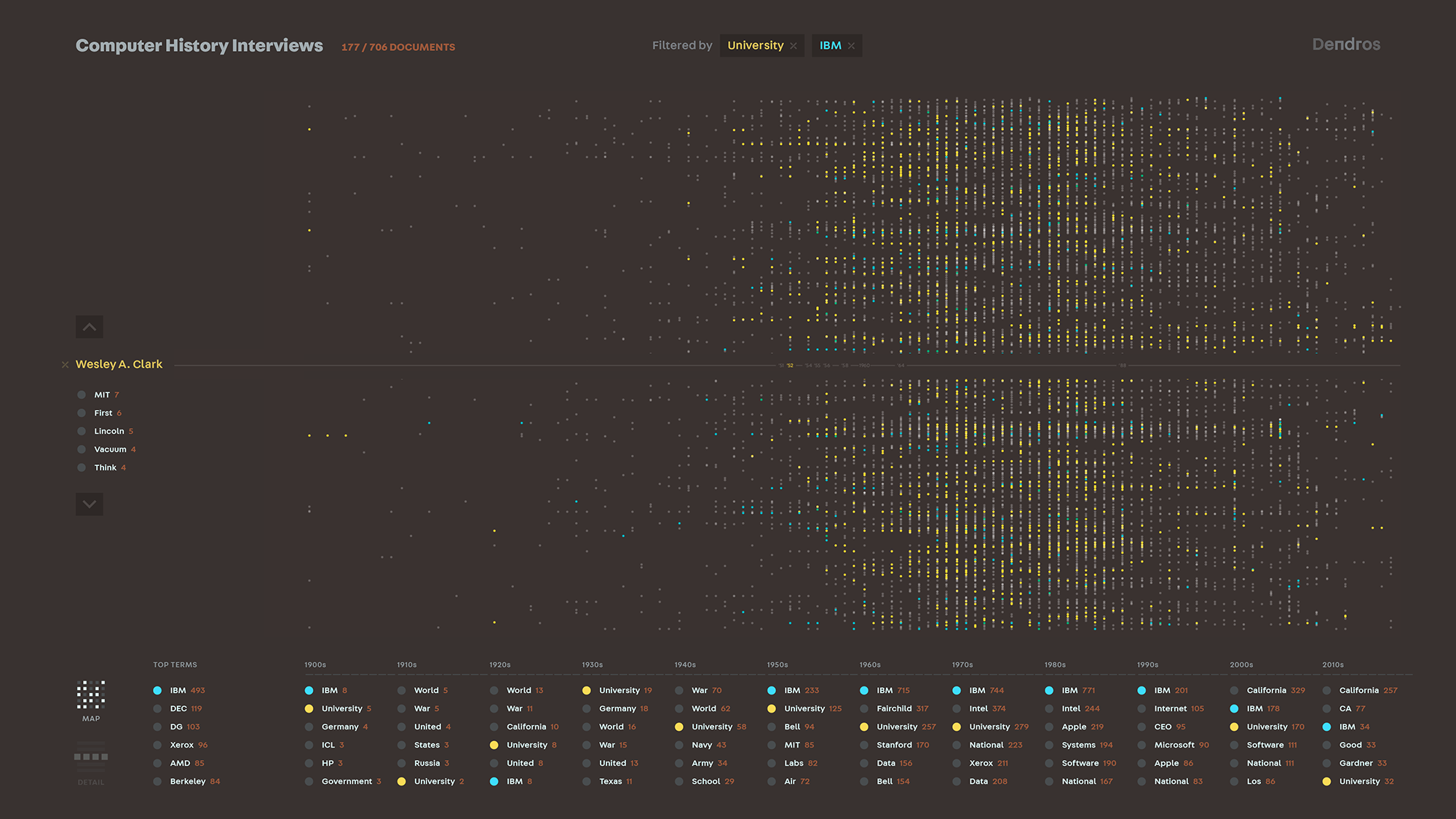 Using this approach, Dendros visualizes a rich landscape of evolving technologies, research and experimentation, the rise and fall of companies and industries, and explosions of cultural change.