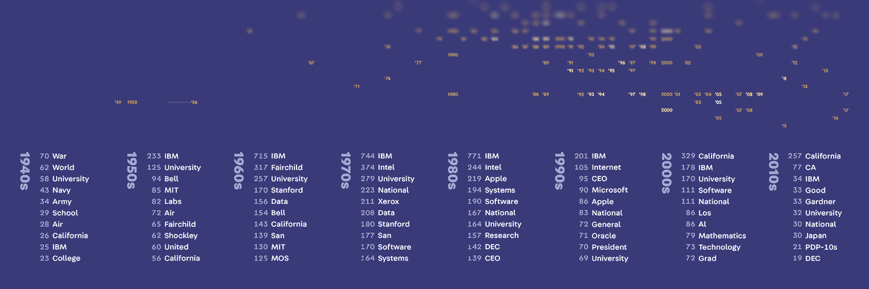 These words suggest overarching forces and pressures that have shaped the history of computing: the pivotal role of both World Wars and Cold War-era competition between the U.S. and the Soviet Union, the outsized presence of a few universities and influential companies like IBM, and California’s gradual emergence as the epicenter of the field, among other themes.