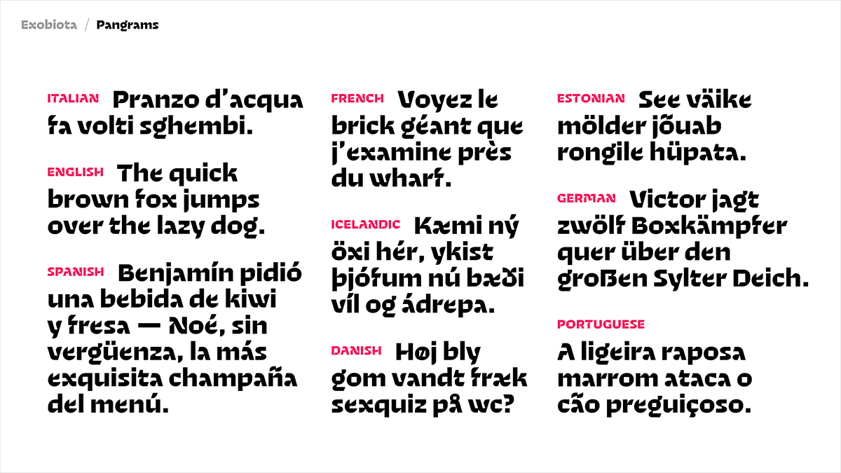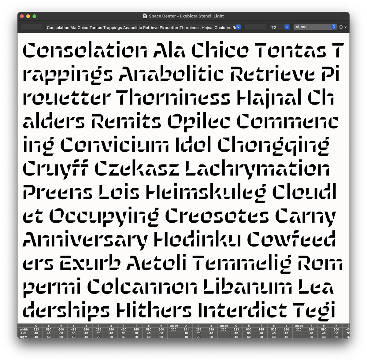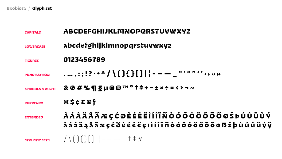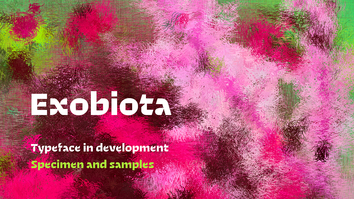 Exobiota is a work-in-progress font with a retrofuturist sensibility. Currently, it includes a heavy weight and samples of a stencil companion style in a lighter weight.
