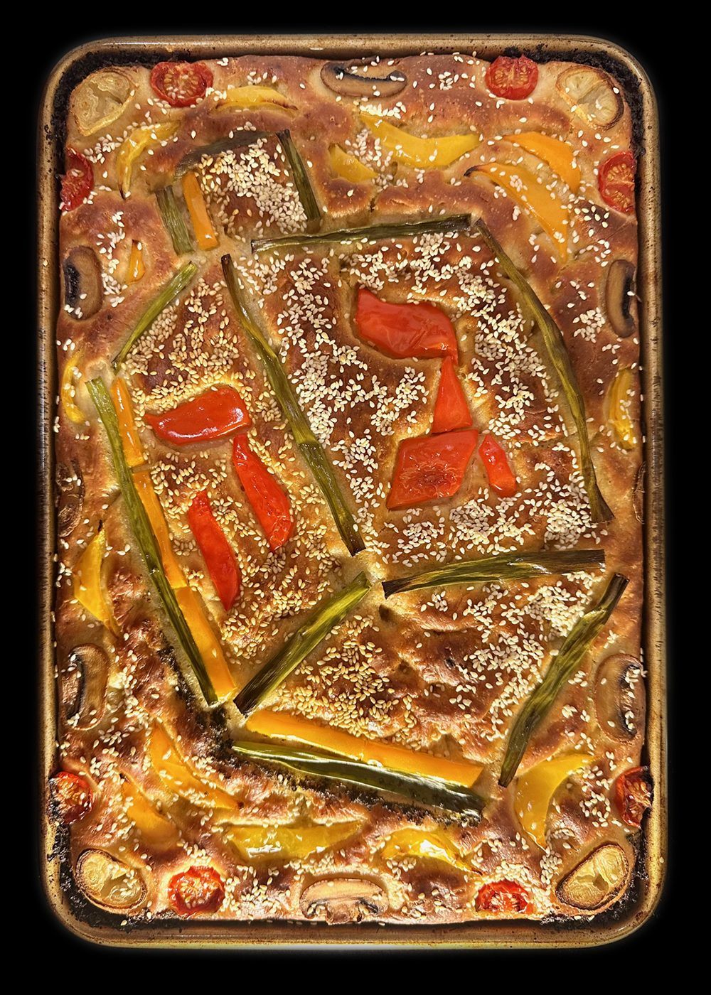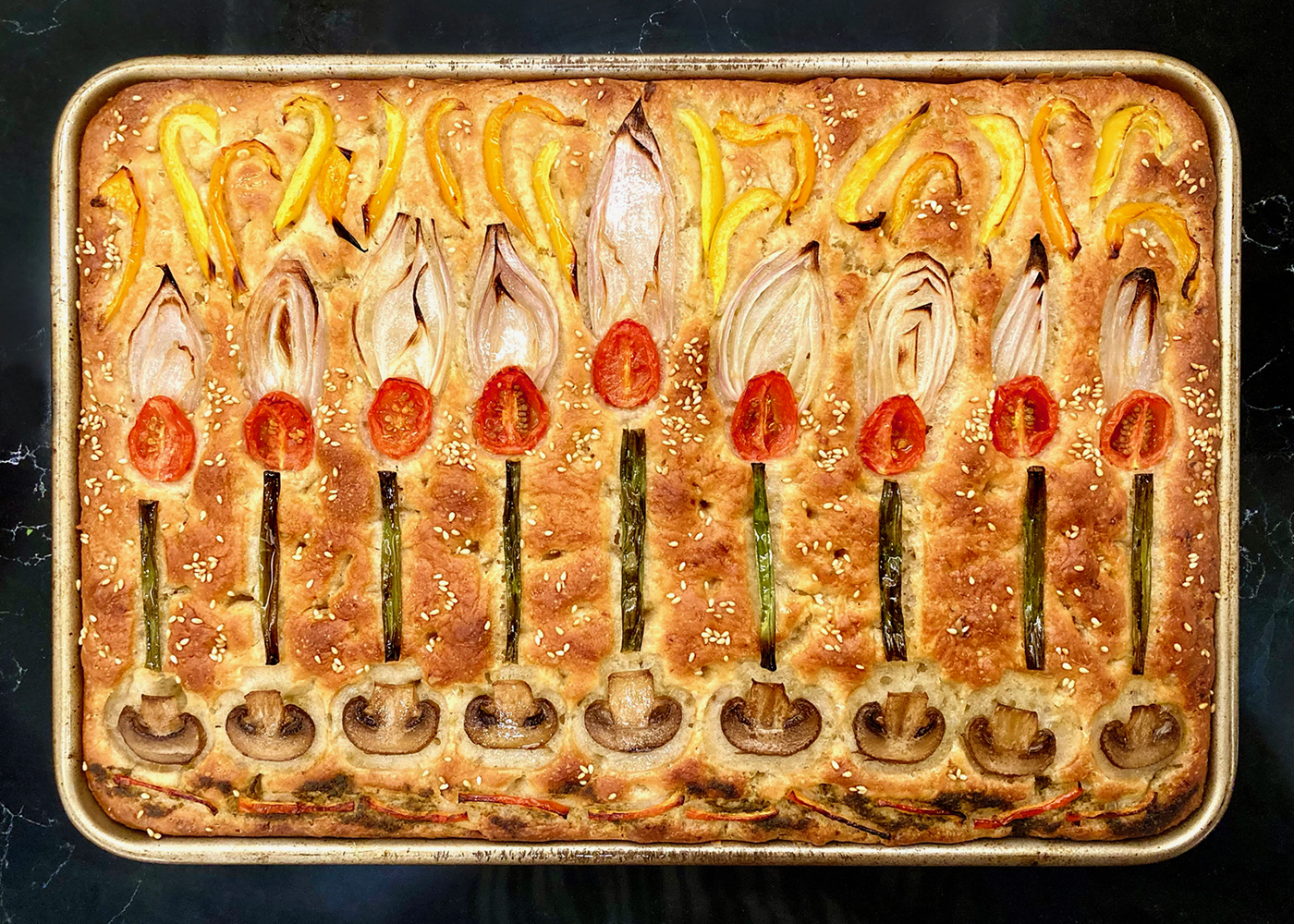 Miso focaccia loaves baked for Hanukkah, illustrated with onions and scallions, mushrooms, pesto, bell peppers, tomatoes, leeks and sesame.