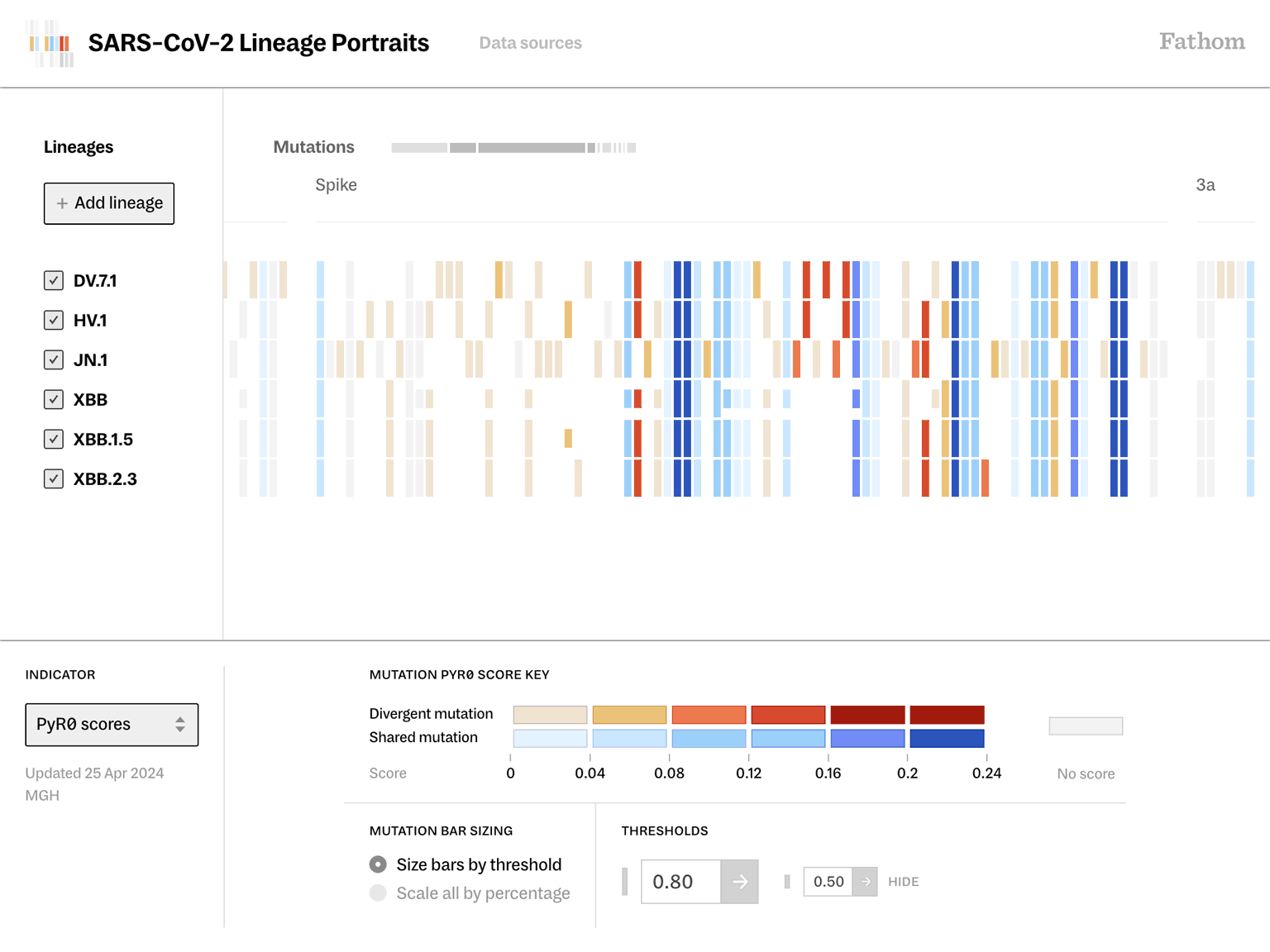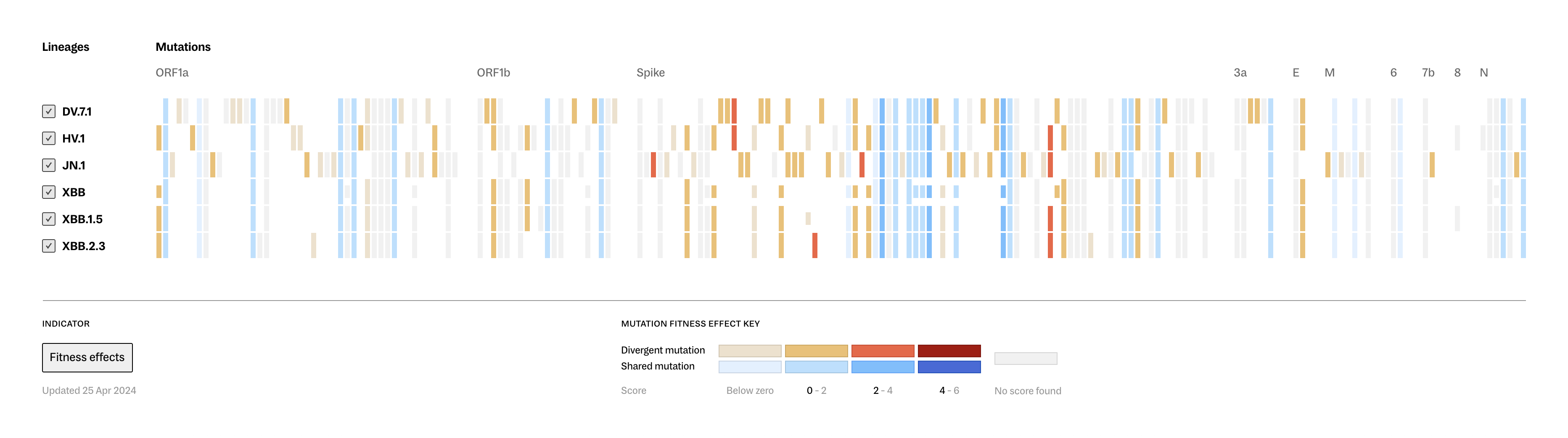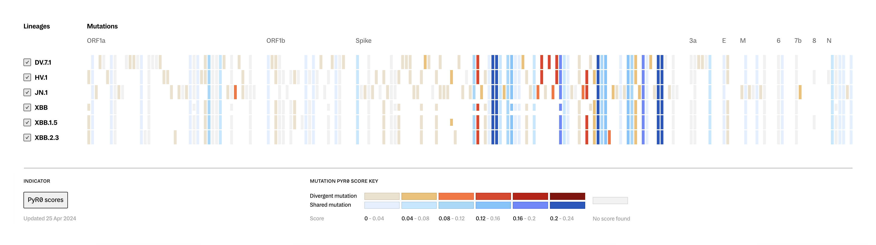 Showing these patterns in the aggregate provides researchers a way to rapidly compare which aspects of new lineages diverge from established ones. The data is updated as new samples are sequenced, and the tool serves as a resource that can be further annotated as a screenshot and added to a slide deck for sharing.