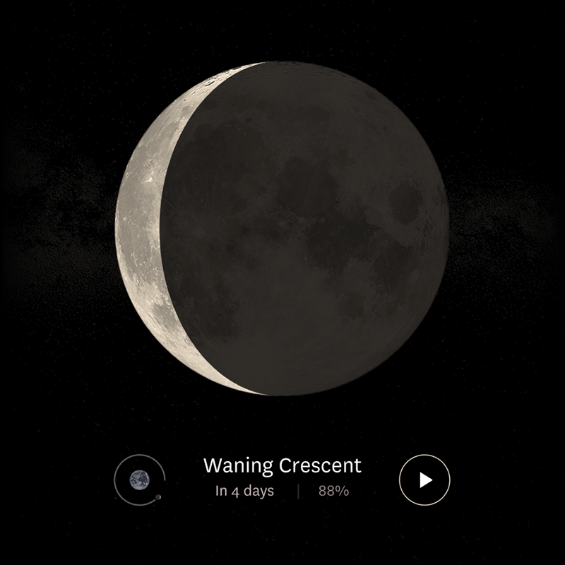 An interactive minisite that calculates and depicts the Moon’s cycle, current phase and relative orientation to the Earth and Sun.