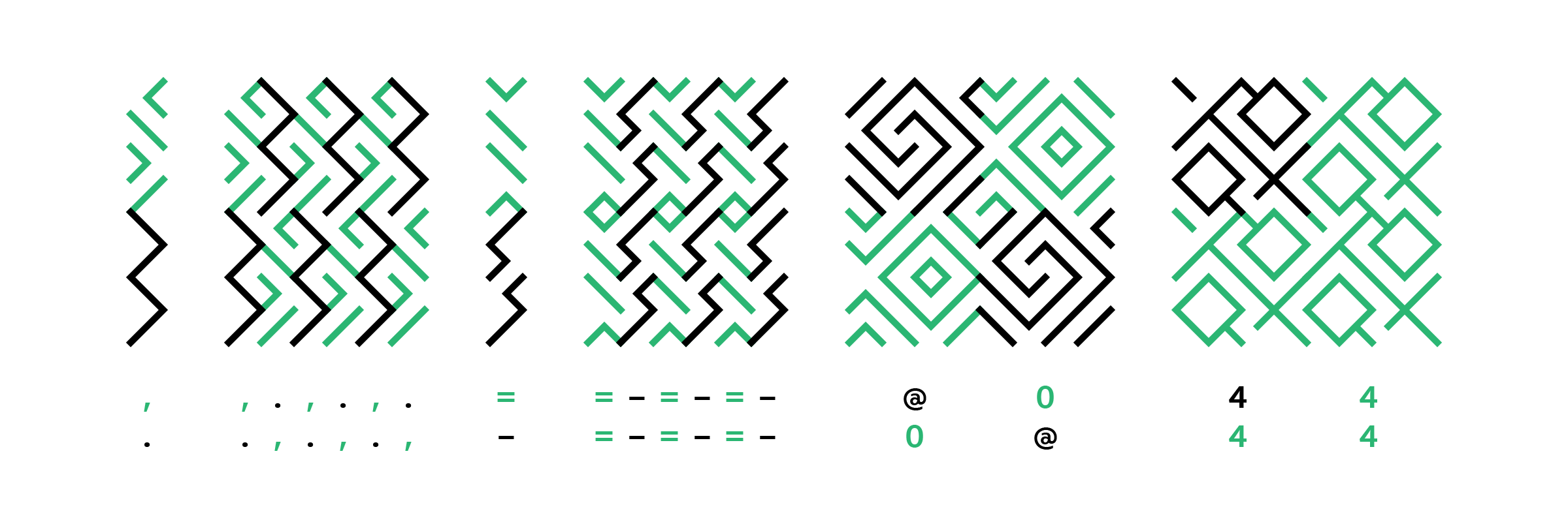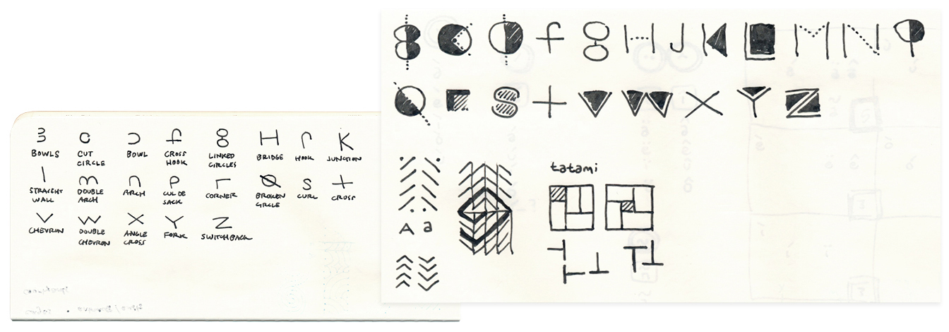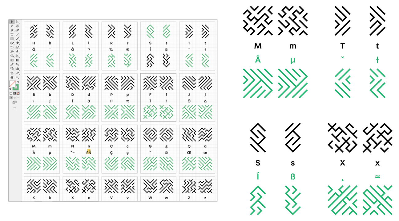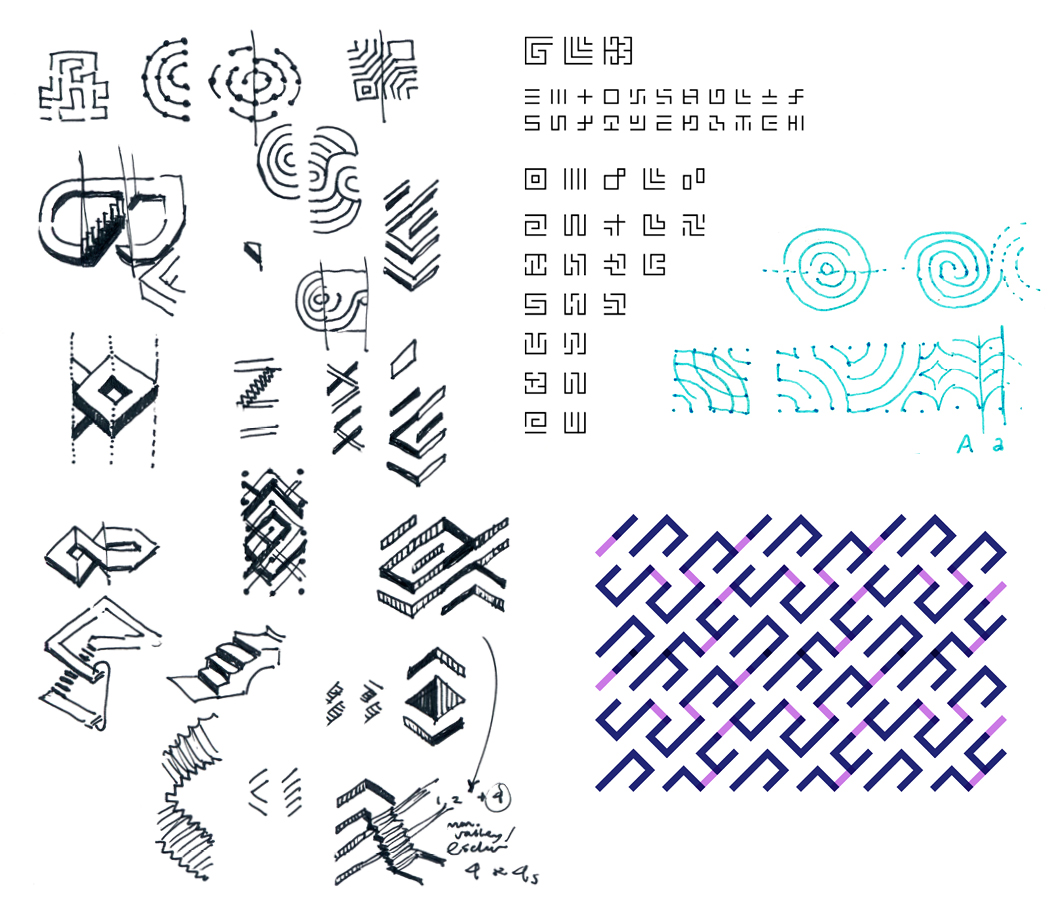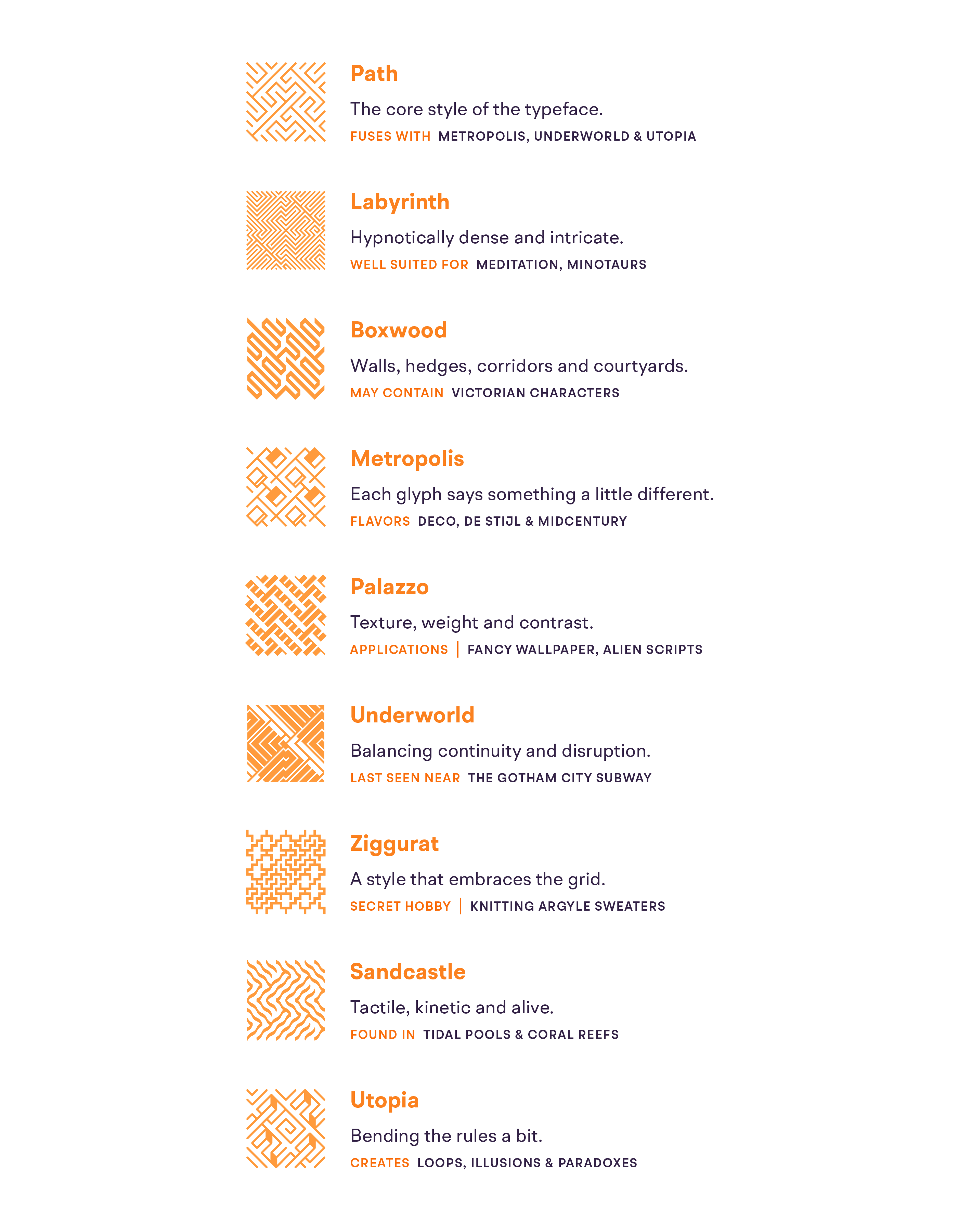 The collection has nine interchangeable styles, and the characters map to pattern units that can be combined to produce different kinds of spirals, loops, switchbacks and endless corridors.