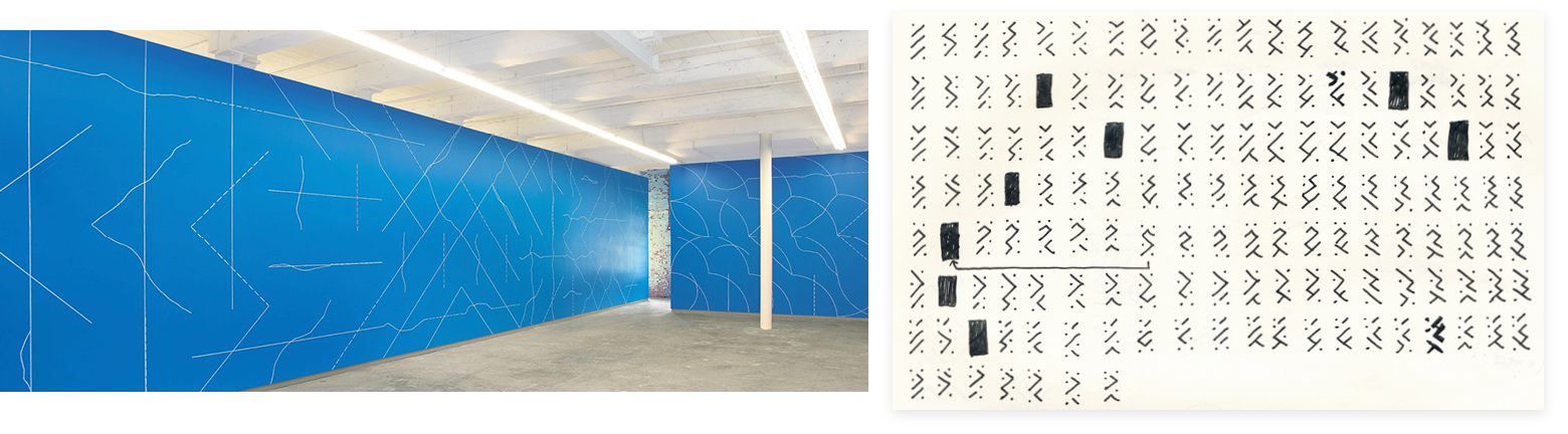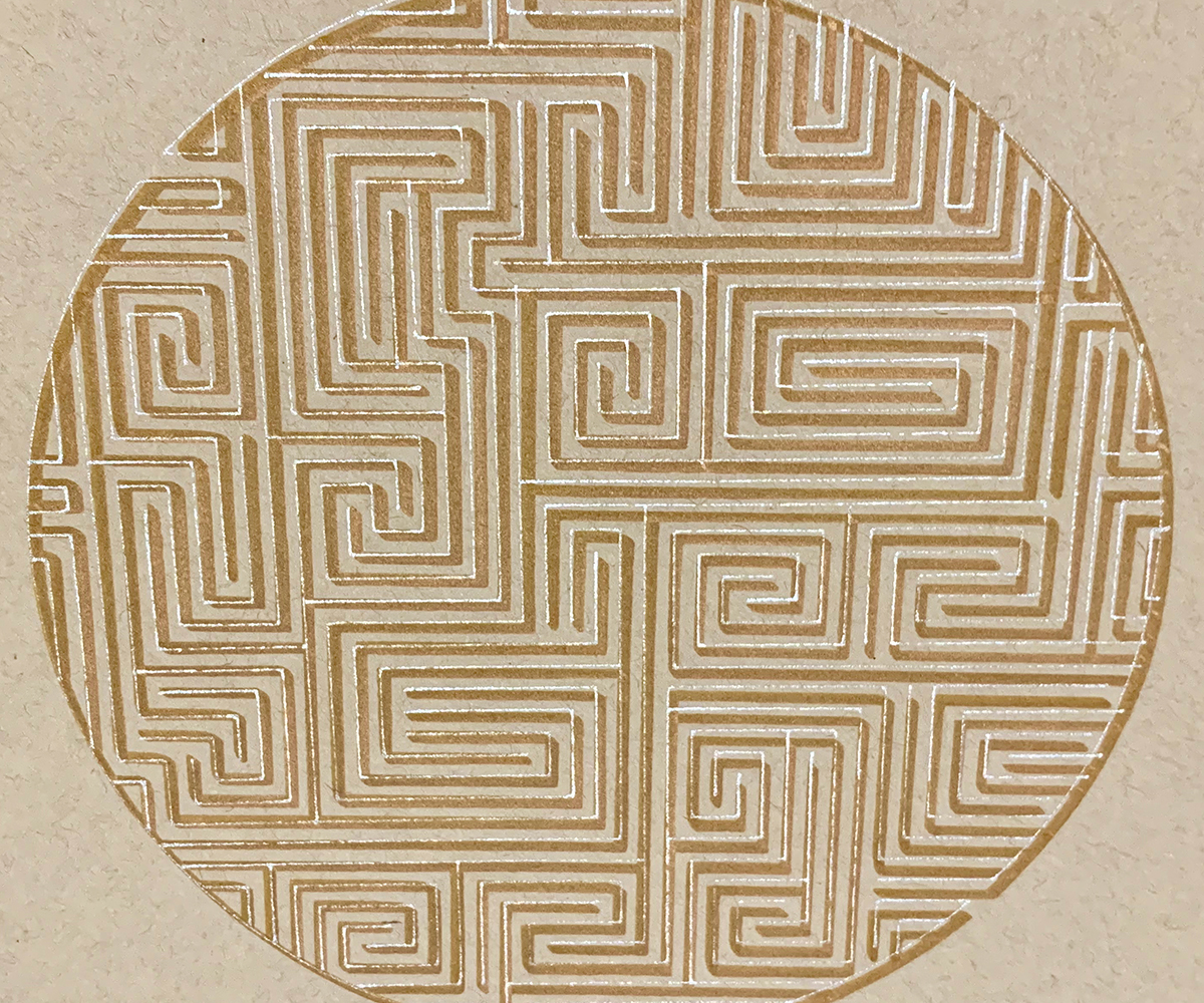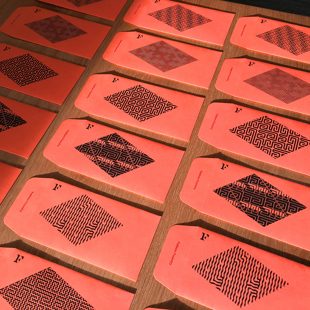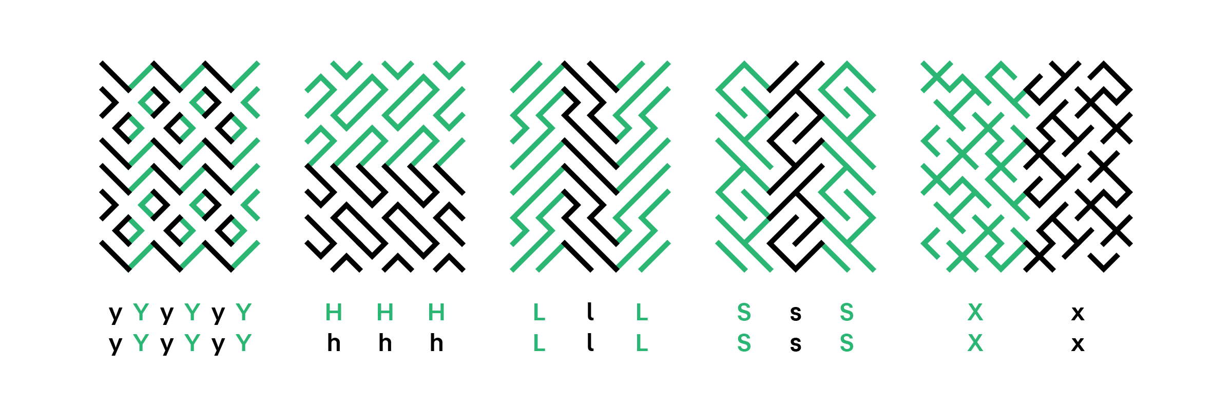 The collection has nine interchangeable styles, and the characters map to pattern units that can be combined to produce different kinds of spirals, loops, switchbacks and endless corridors.